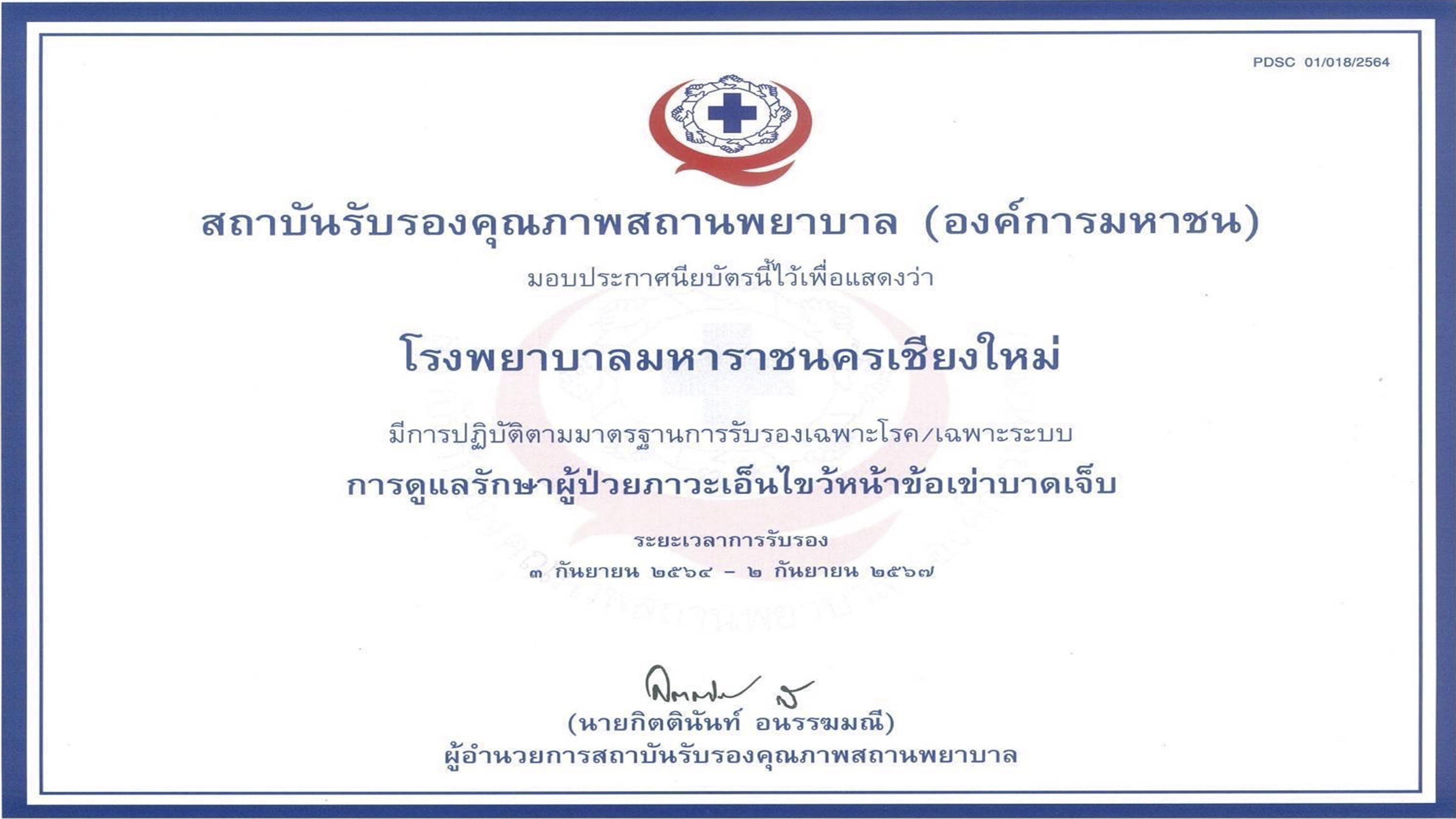 ใบประกาศนียบัตรรับรองคุณภาพสถานพยาบาลของโรงพยาบาลมหาราชนครเชียงใหม่