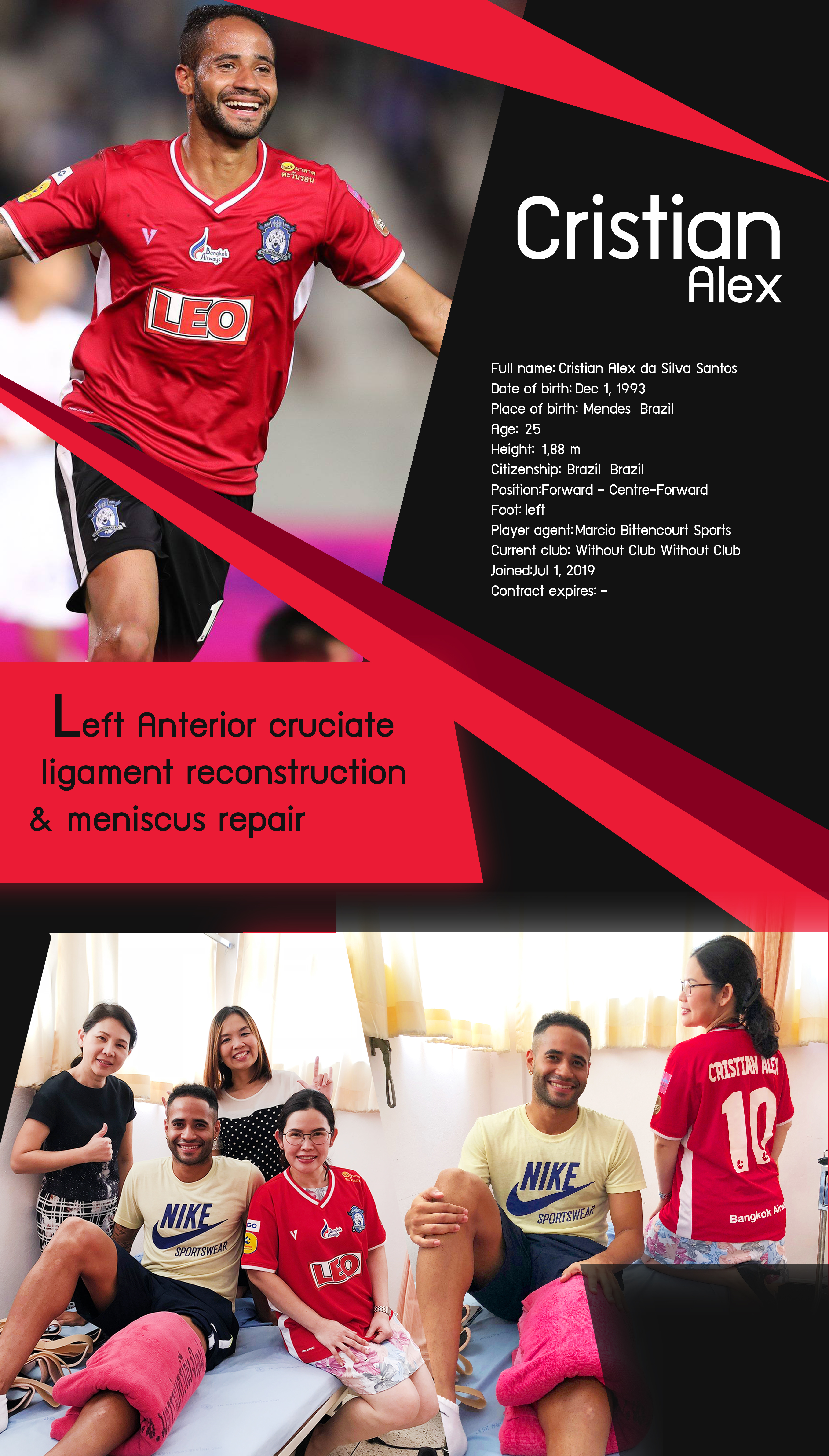 Cristian Alex เข้ากับการรักษา Left Anterior cruciate ligament reconstruction & meniscus repair กับทาง Chiang Mai Orthopedics Sports medicine & Physical Therapy Center เมื่อเดือนที่ผ่านมา การรักษาผ่าตัดของ Cristian Alex สำเร็จไปได้ด้วยดี และกำลังอยู่ในขั้นตอนการกายภาพบำบัดต่อไป