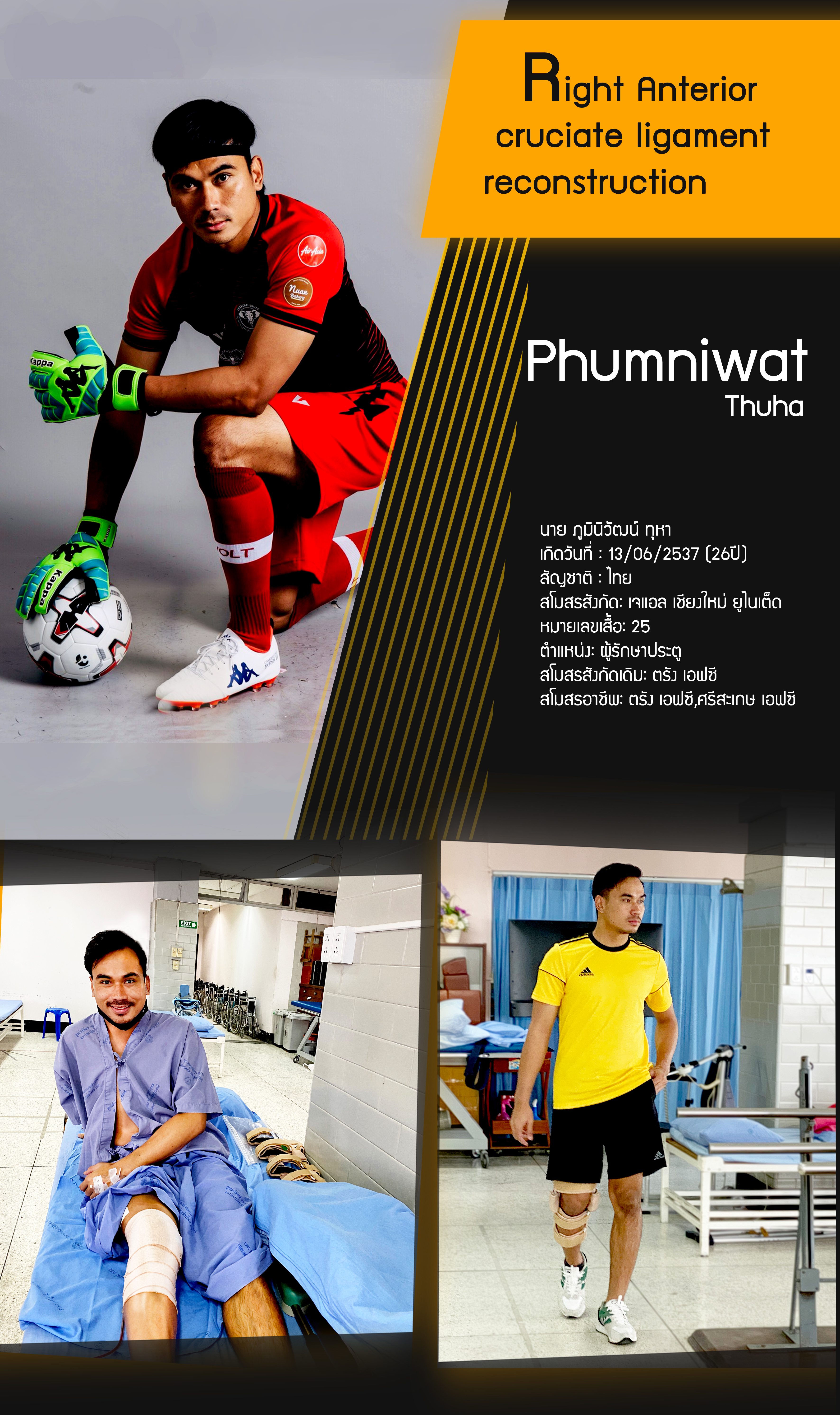 Phumniwat Thuha เข้ากับการรักษา Right Anterior cruciate ligament reconstruction & meniscus repair กับทาง Chiang Mai Orthopedics Sports medicine Physical Therapy Center เมื่อเดือนตุลาคมที่ผ่านมา การรักษาผ่าตัดของ สำเร็จไปได้ด้วยดี และกำลังอยู่ในขั้นตอนการกายภาพบำบัดต่อไป